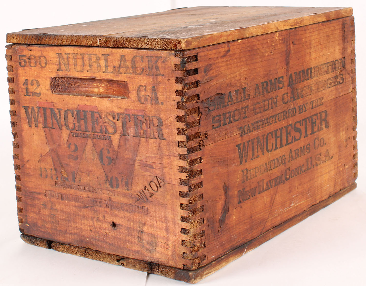 Winchester NUBLACK, 12 Ga. 3 - 1 - 6, tongue and groove construction wood shipping crate, has lid that has hinges added to it, black print is fading, crate has age soiling, has small paper on one side stating '' License to trade in USA... Win Repeating Arms Co.''. Grade: Very Good - Value: 40 to 100