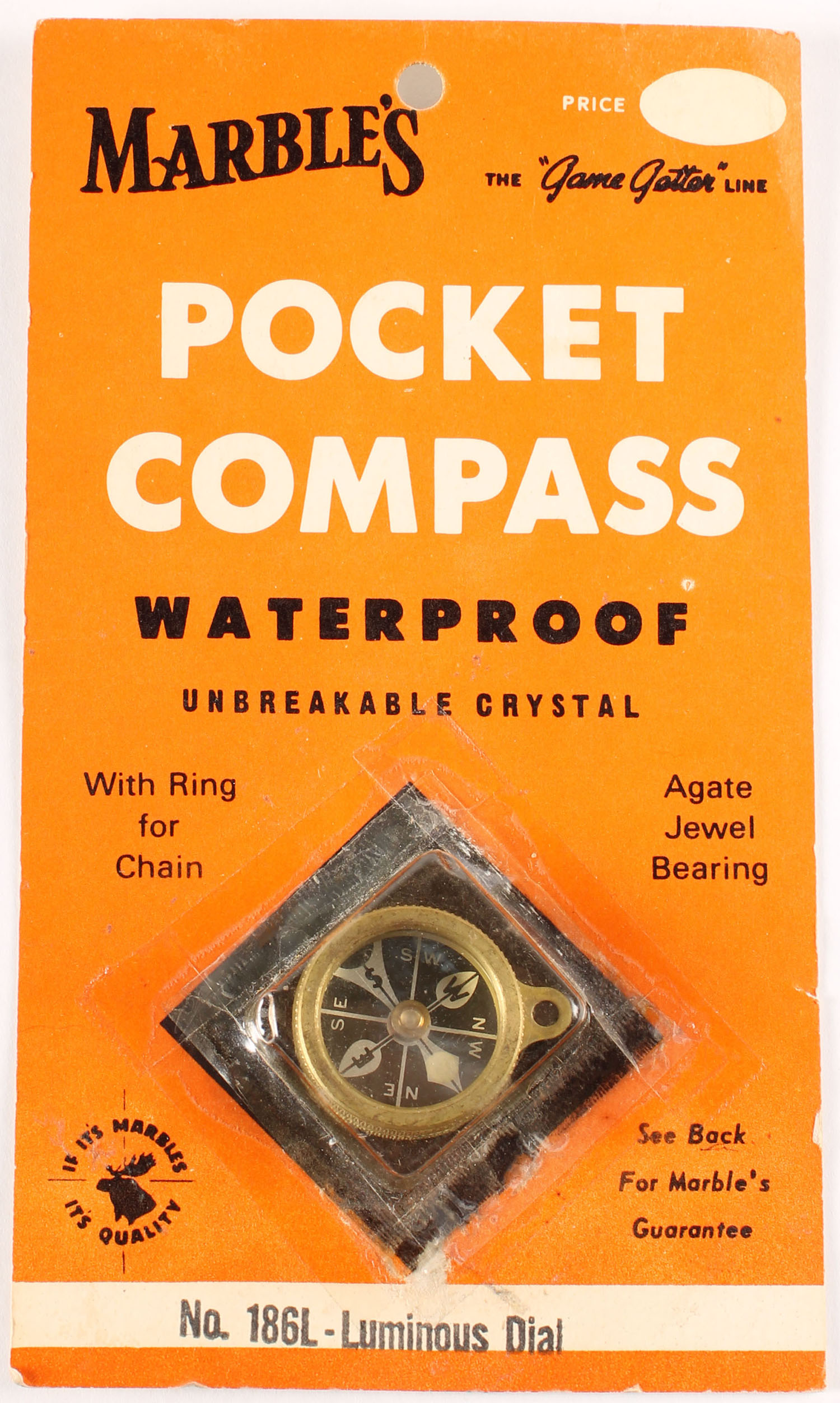 Marbles pocket compass, in orignal packaging, resealed with tape, compass appears broken. Grade: Very Good - Value: 6 to 40