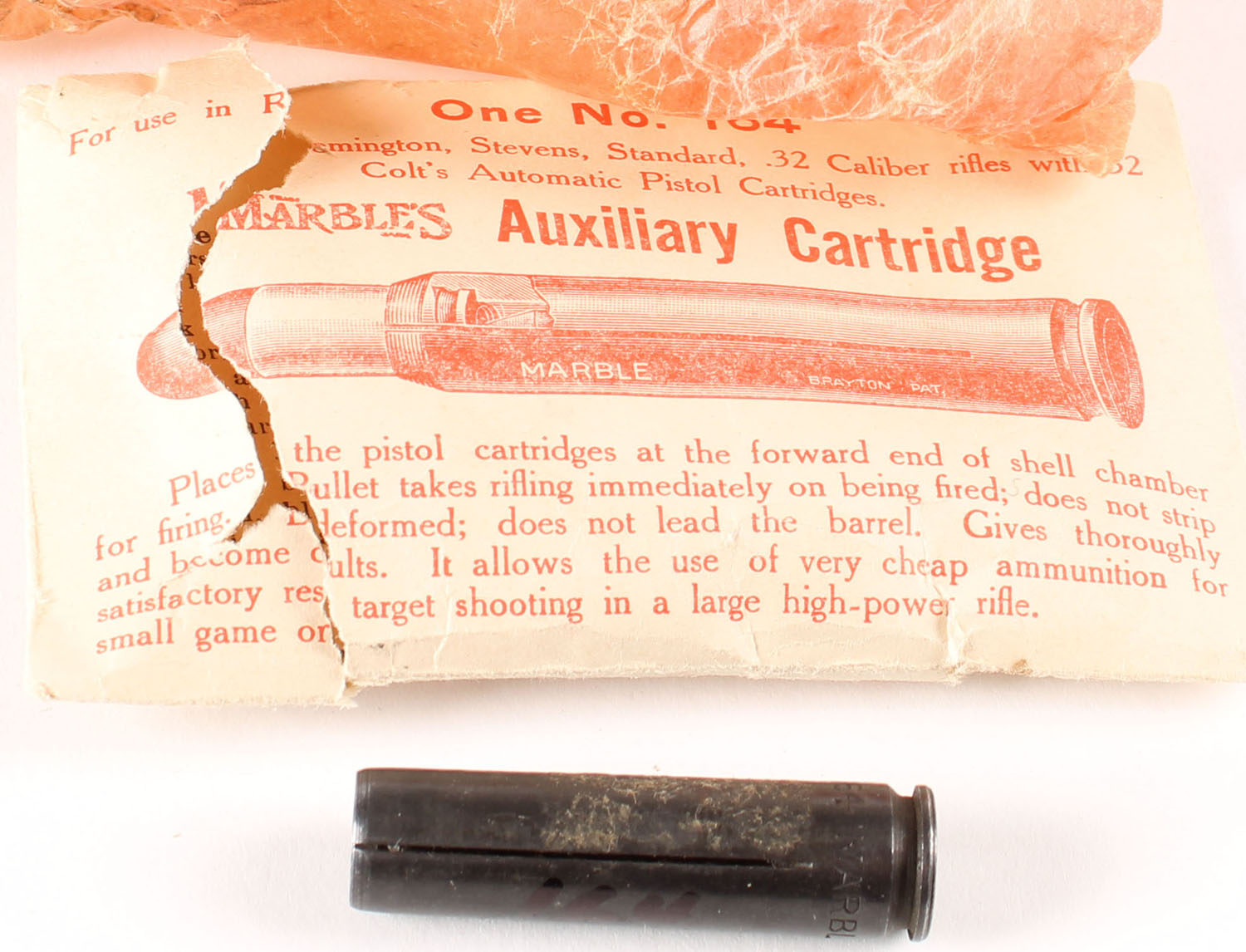 Marbles Auxiliary cart., .32 colts pistol cal to 32 rifle cal., No. 164 in original packaging. Grade: Excellent - Value: 10 to 30