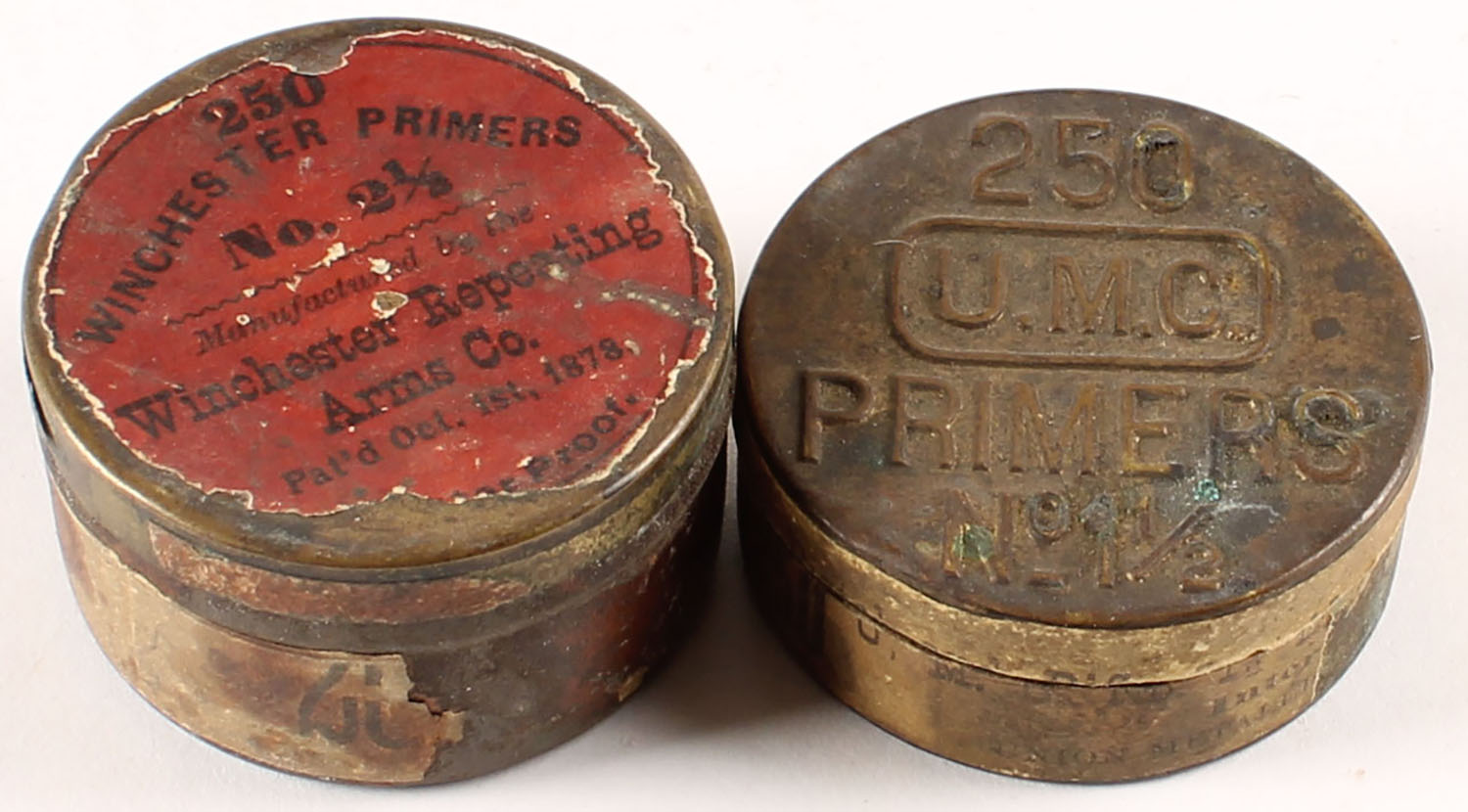 Winchester and UMC primer tins, both partial, both have age soiling. Grade: Very Good ++ - Value: 10 to 50