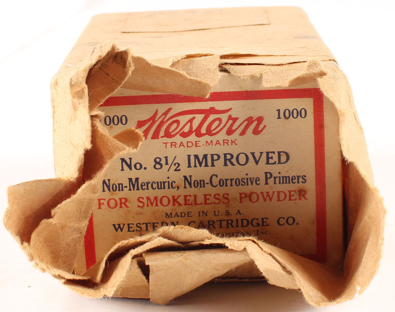 Western primer brick, Full, Marshall-WELLS Co. paper wrap around, open on one end. Grade: Excellent - Value: 40 to 150