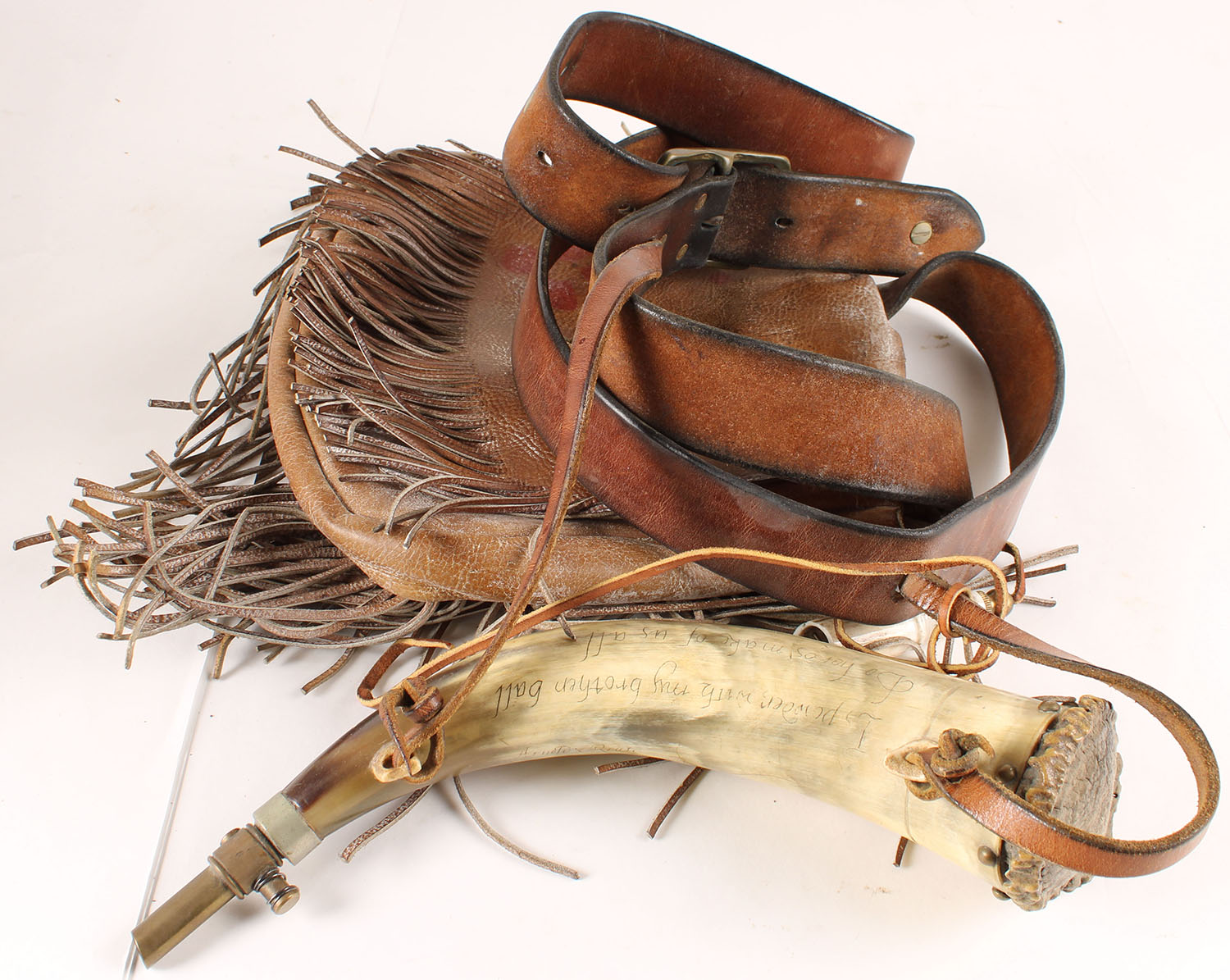 Powder horn and leather bag, powder horn marked 1775 with other writings, 12'', very bright and clean. Grade: Excellent - Value: 40 to 150