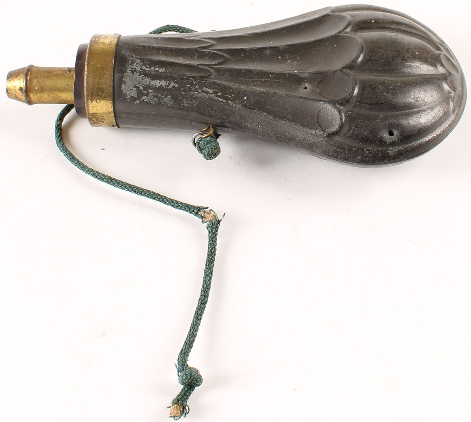 Metal powder flask, has small holes, Empty. Grade: Very Good - Value: 4 to 50