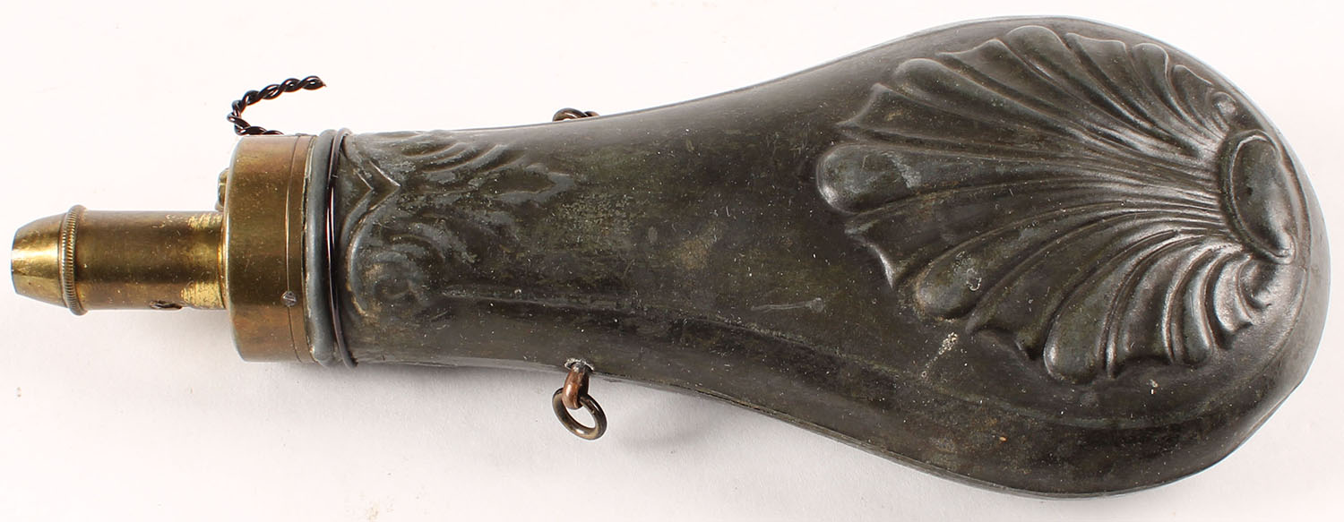 Powder flask, unmarked with beautiful design, has age soiling Grade: Very Good - Value: 20 to 80