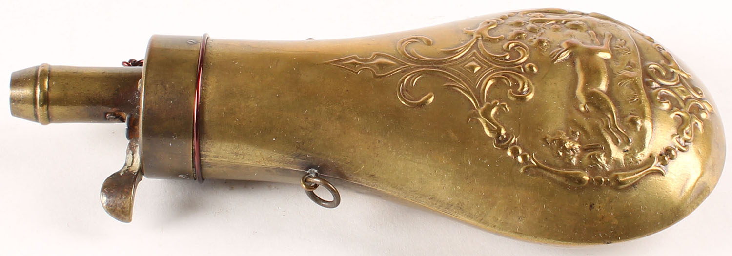 Brass Powder flask, unmarked with beautiful design, has age soiling Grade: Very Good - Value: 20 to 80