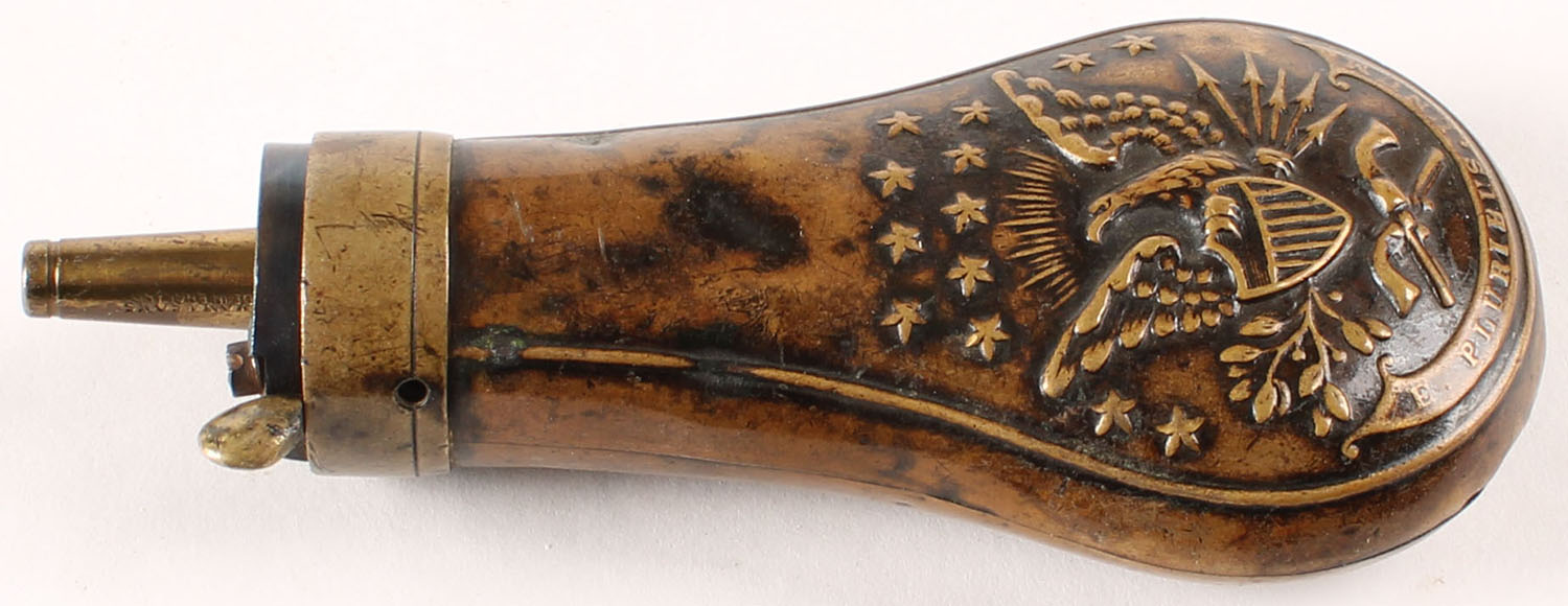 Small Brass Powder flask, has beautiful design, Empty. Grade: Very Good ++ - Value: 16 to 60
