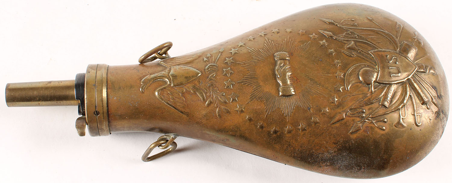 US Brass Powder flask, has beautiful design, has some powder. Grade: Very Good ++ - Value: 30 to 90