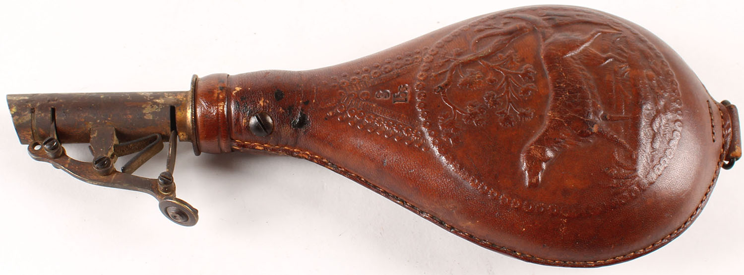 Early! AM & Flask Co. Leather Powder flask, has beautiful design of english setter on both sides. Grade: Very Good ++ - Value: 40 to 150
