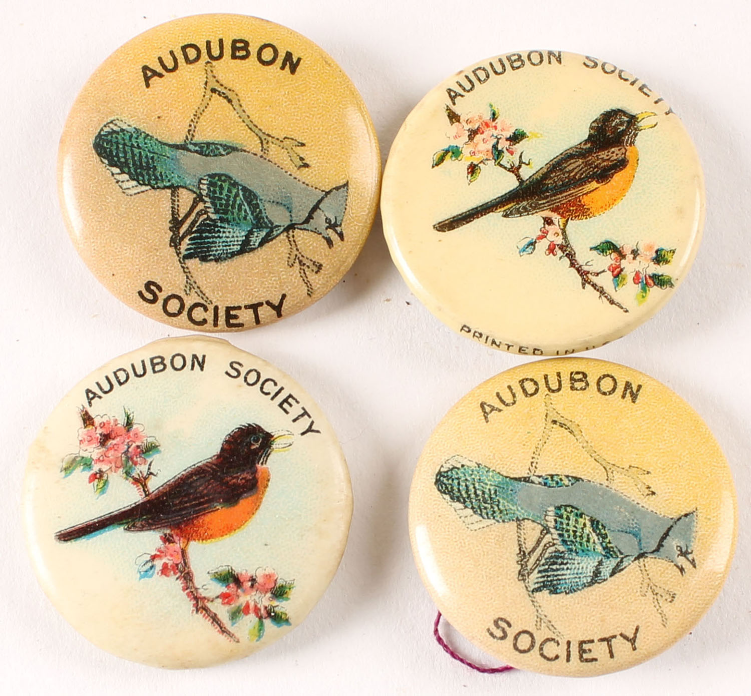 Lot of 4 antique bird pinbacks. Grade: Excellent - Value: 10 to 50