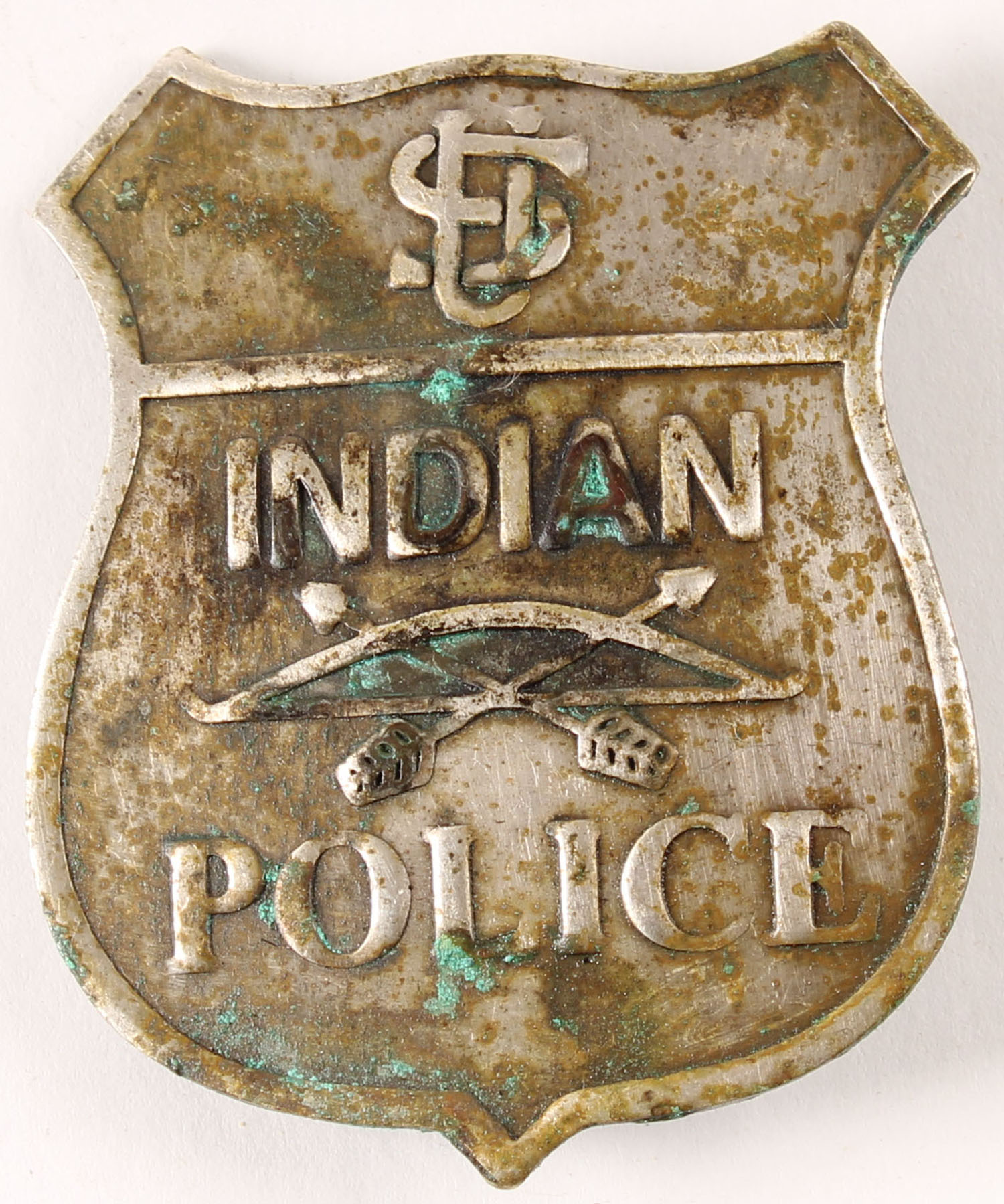 Indian Police badge with crossed arrows and bow dated 1888 pinback. Grade: Very Good ++ - Value: 100 to 600