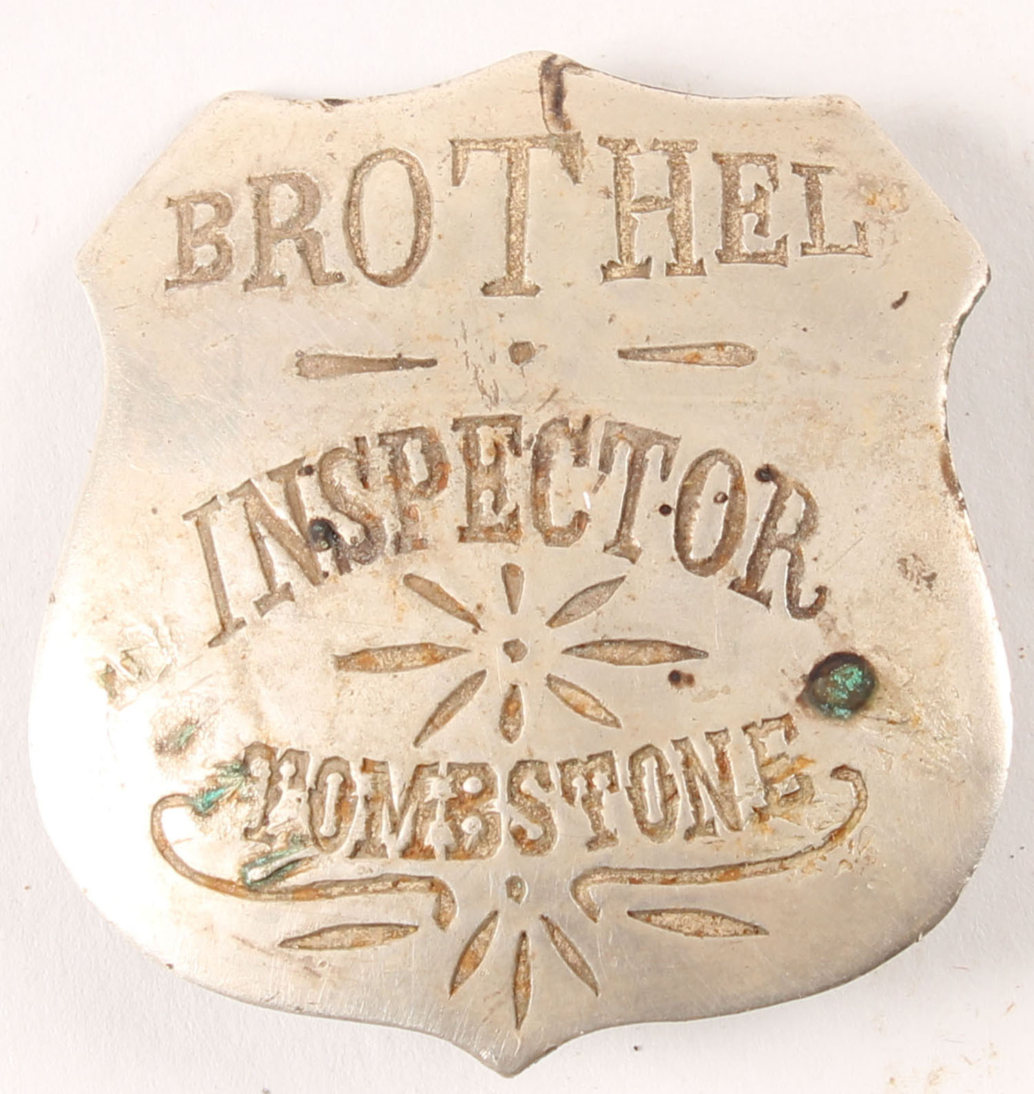 Brothel Inspector Tombstone dated 1885 pinback. Grade: Very Good ++ - Value: 100 to 600