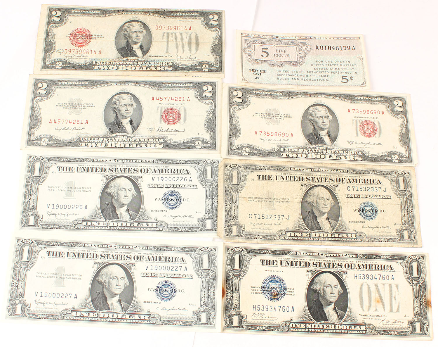 Lot of collectible US currency, $1 silver certificate and $2 bills, all solid. Grade: Excellent - Value: 20 to 100
