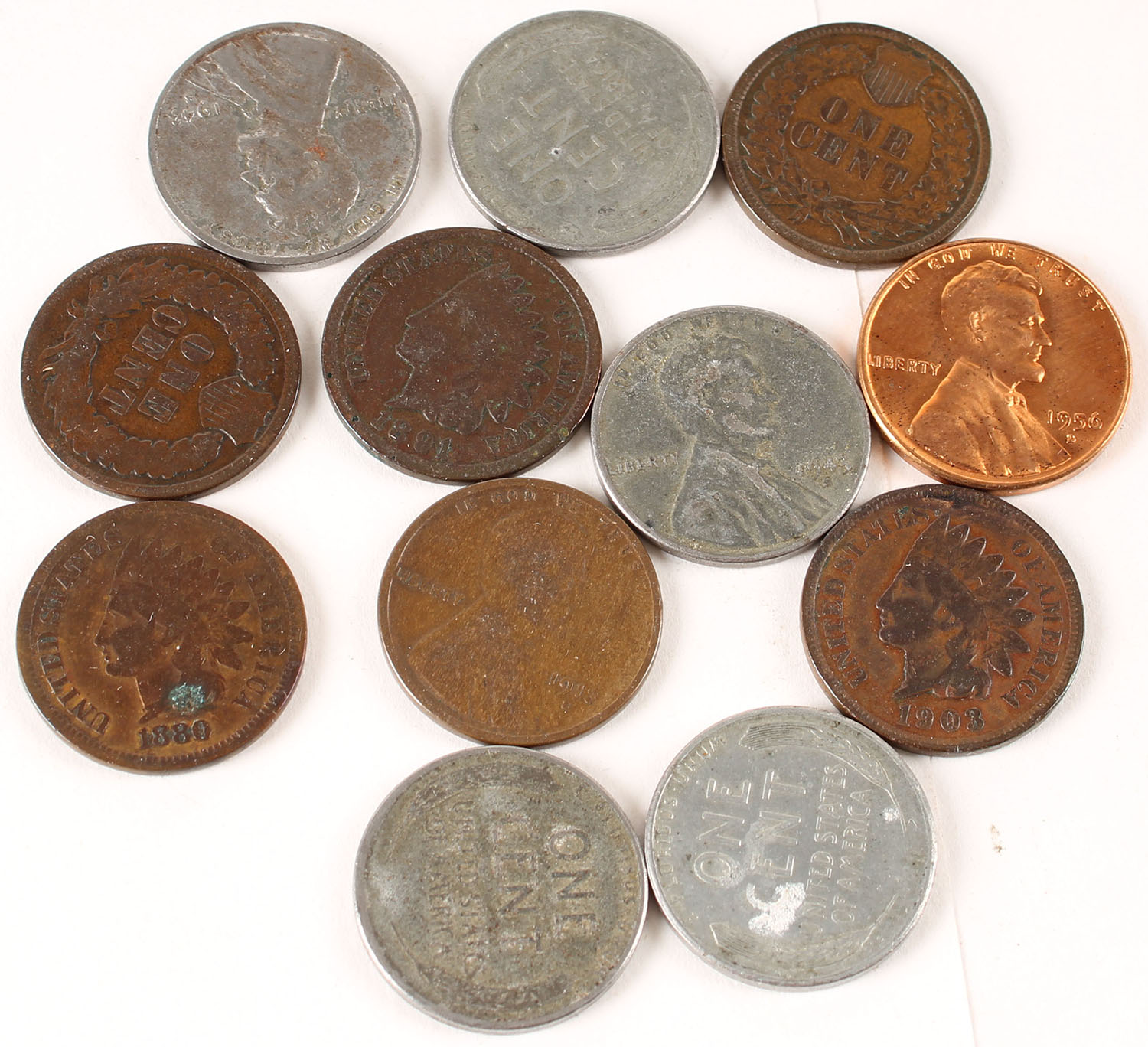 Lot of Rare pennies, 5 Indian head logo, 5 steel coated zinc made during WWII, 1956 D, and a 1913 wheat penny . Grade: Very Good + - Value: 10 to 100