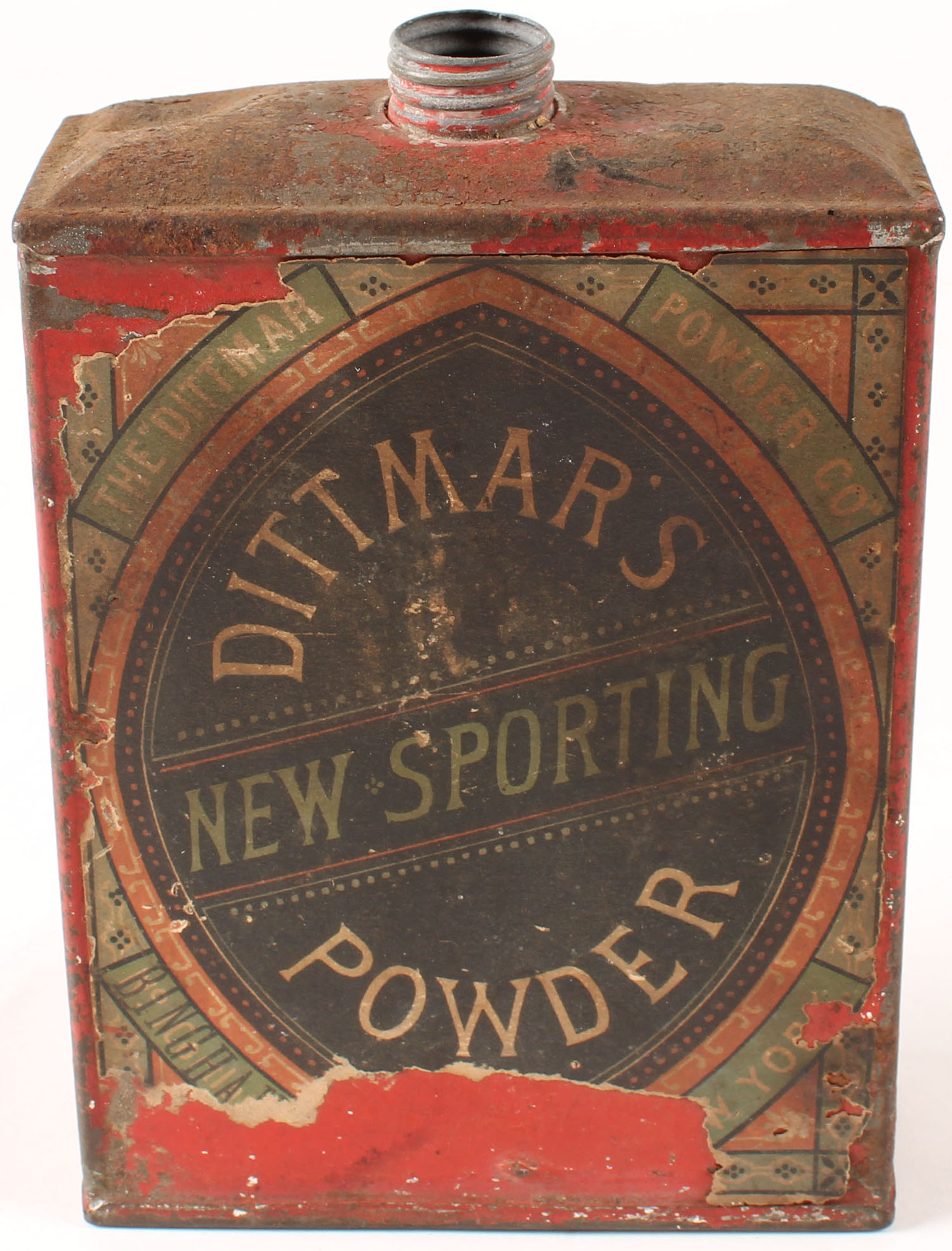 Antique powder tin, no cap, Ditmars new Sporting Powder, circa 1880s, has age soiling and damage to label. Grade: Very Good - Value: 100 to 600