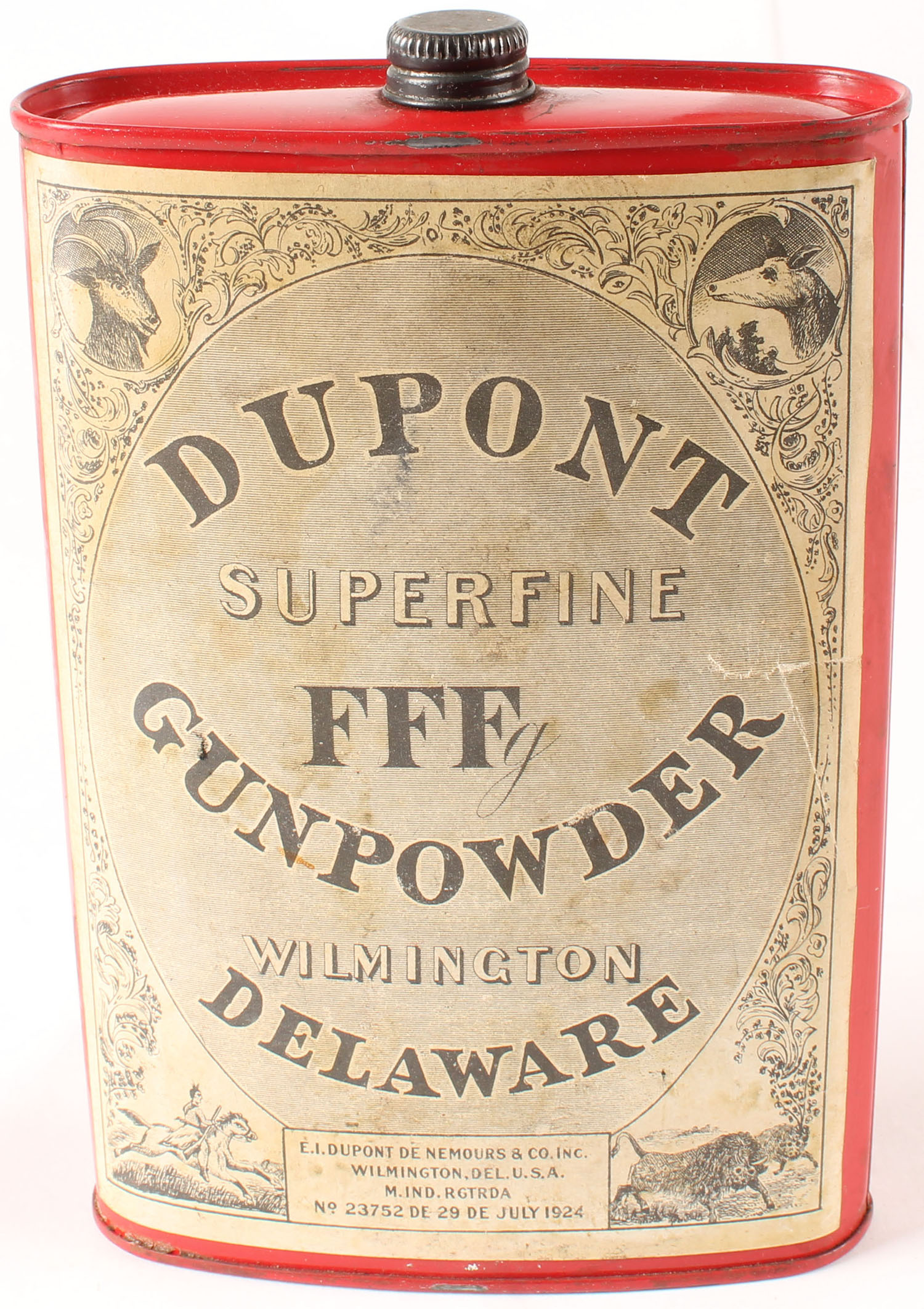 Dupont FFF GunPowder, Empty, has age soiling. Grade: Excellent - Value: 16 to 60