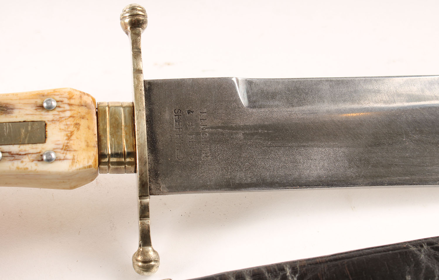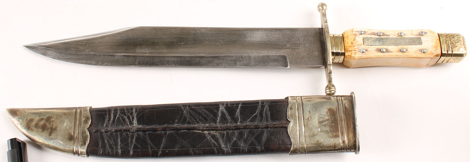 RARE! EARLY! ''J. English & Hubers Sheffield'' Bowie Knife, full hilt, horn handle, 10'' blade, has orignal leather and metal sheath!, Still very solid. Grade: Excellent - Value: 500 to 2000