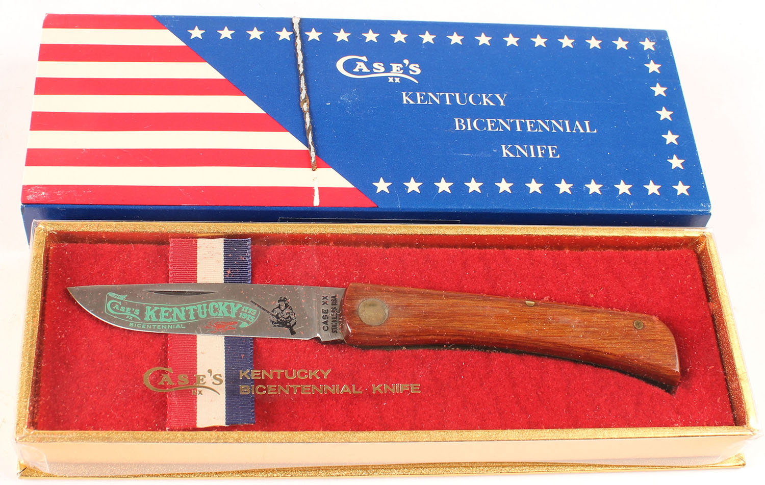 RARE! Case Kentucky Bicentennial knife, wood handle 3'' blade, has display box. Grade: Excellent - Value: 20 to 50