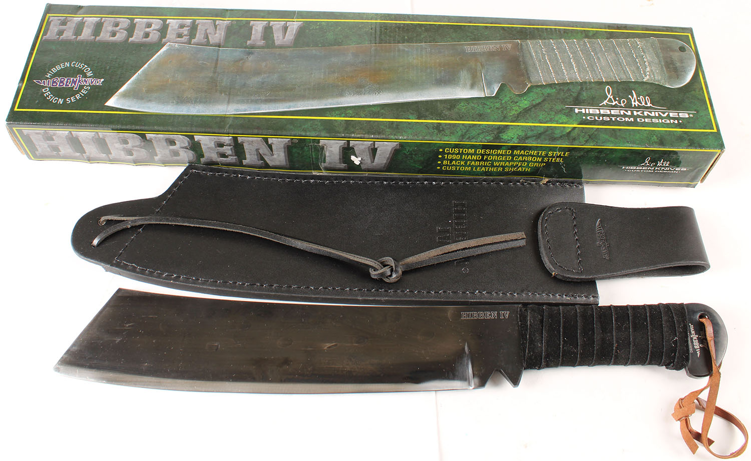 Hibben IV knife, in original case with leather sheath, has a 11'' blade. Grade: Excellent ++ - Value: 30 to 90