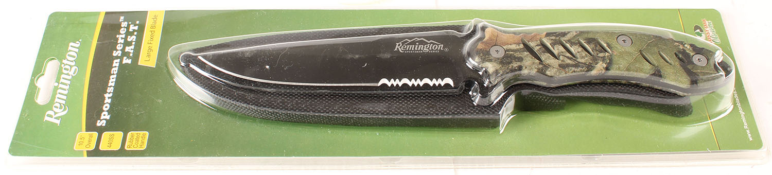 Remington FAST knife, sealed in original case with leather sheath, about a 5'' blade. Grade: Excellent ++ - Value: 16 to 50