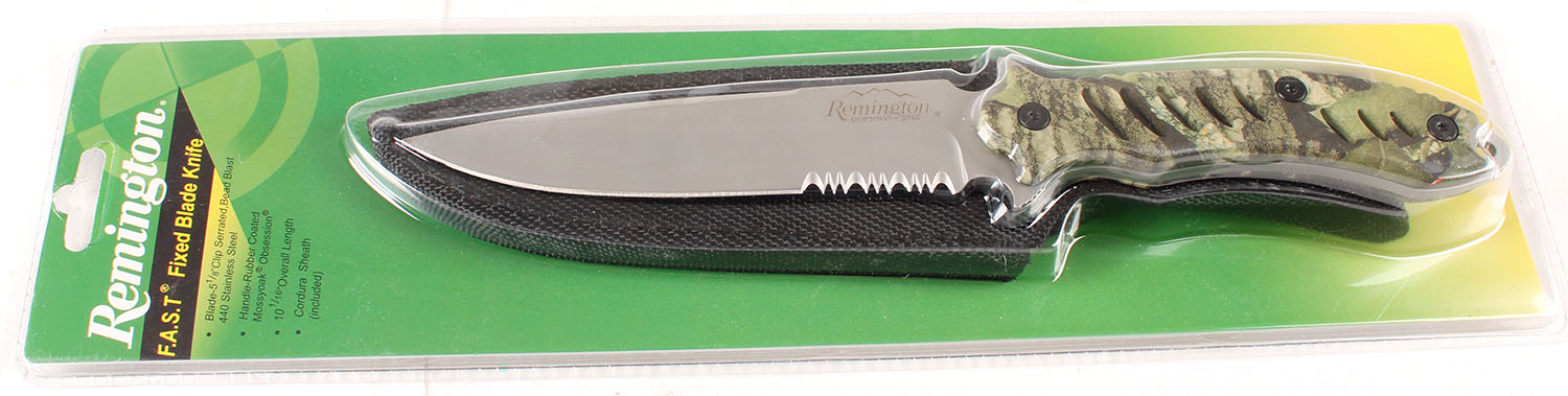 Remington FAST knife, sealed in original case with leather sheath, about a 5'' blade. Grade: Excellent ++ - Value: 16 to 50