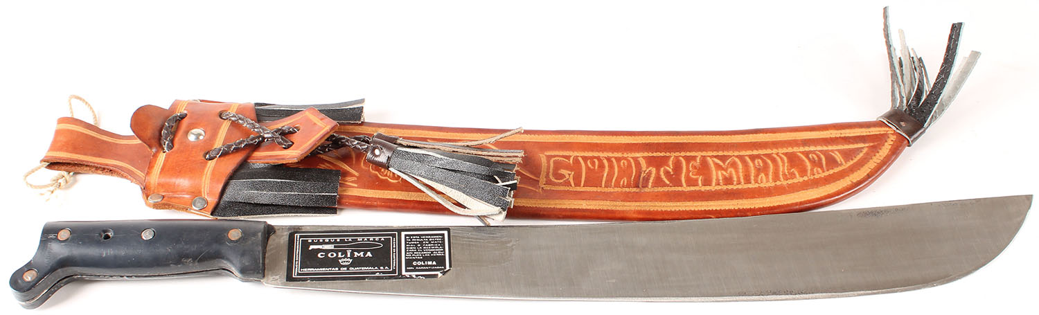 Large Foreign machete, in original sheath, has a 18'' blade, shows some use to blade. Grade: Excellent - Value: 30 to 90