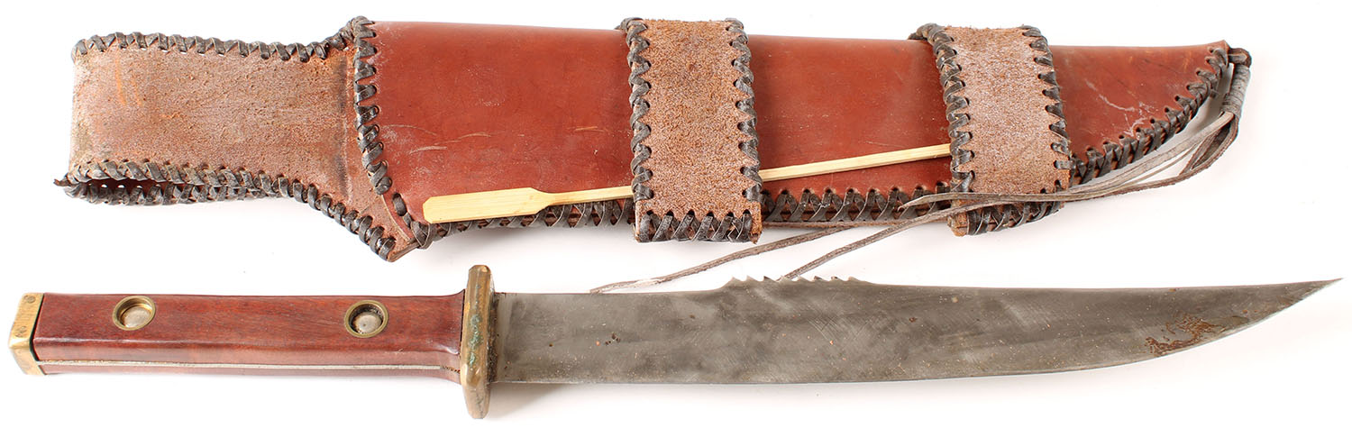 Unmarked knife, in original sheath, has a 12'' blade. Grade: Very Good ++ - Value: 16 to 50