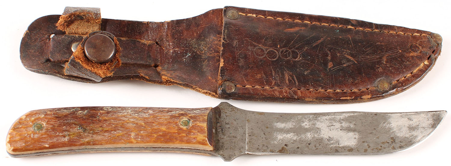 Rem UMC knife, fixed blade knife, 4'' blade, RH4, has leather sheath, has age soiling. Grade: Very Good ++ - Value: 10 to 50