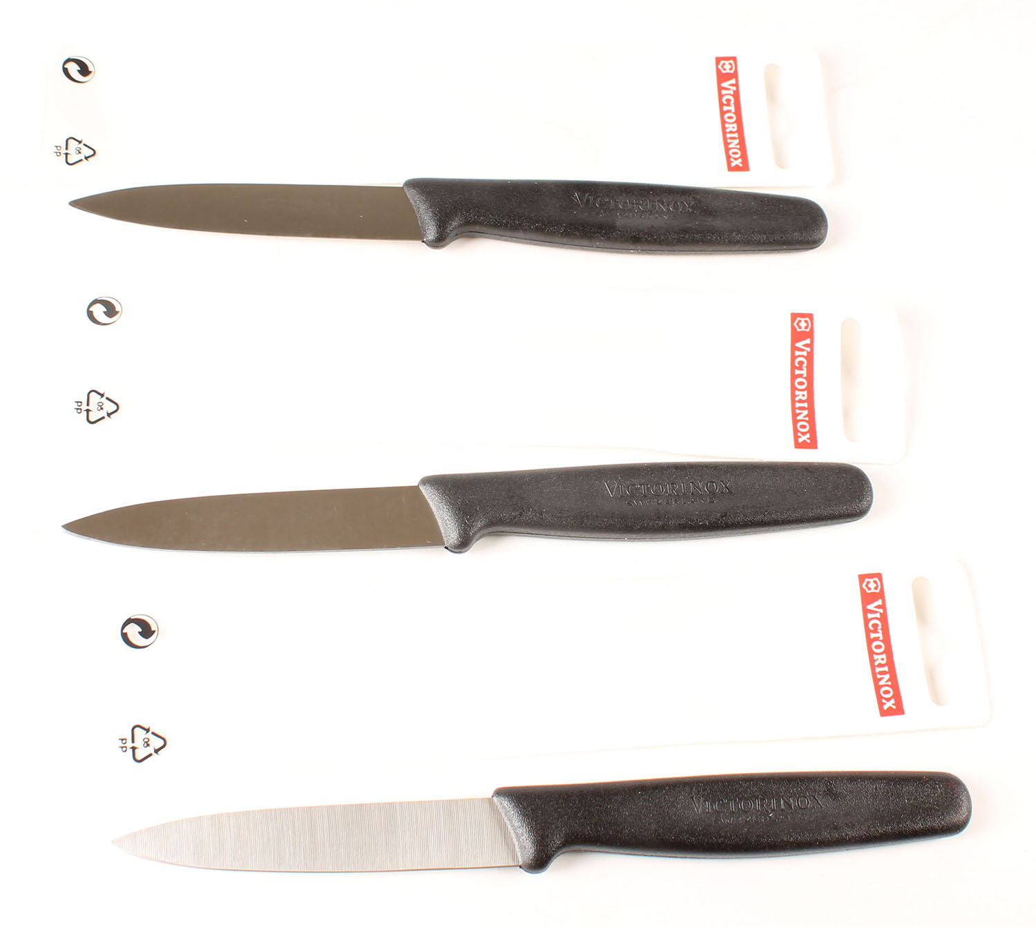 Lot of 3 Victorinox fixed blade knives, in case. Grade: MINT - Value: 10 to 50