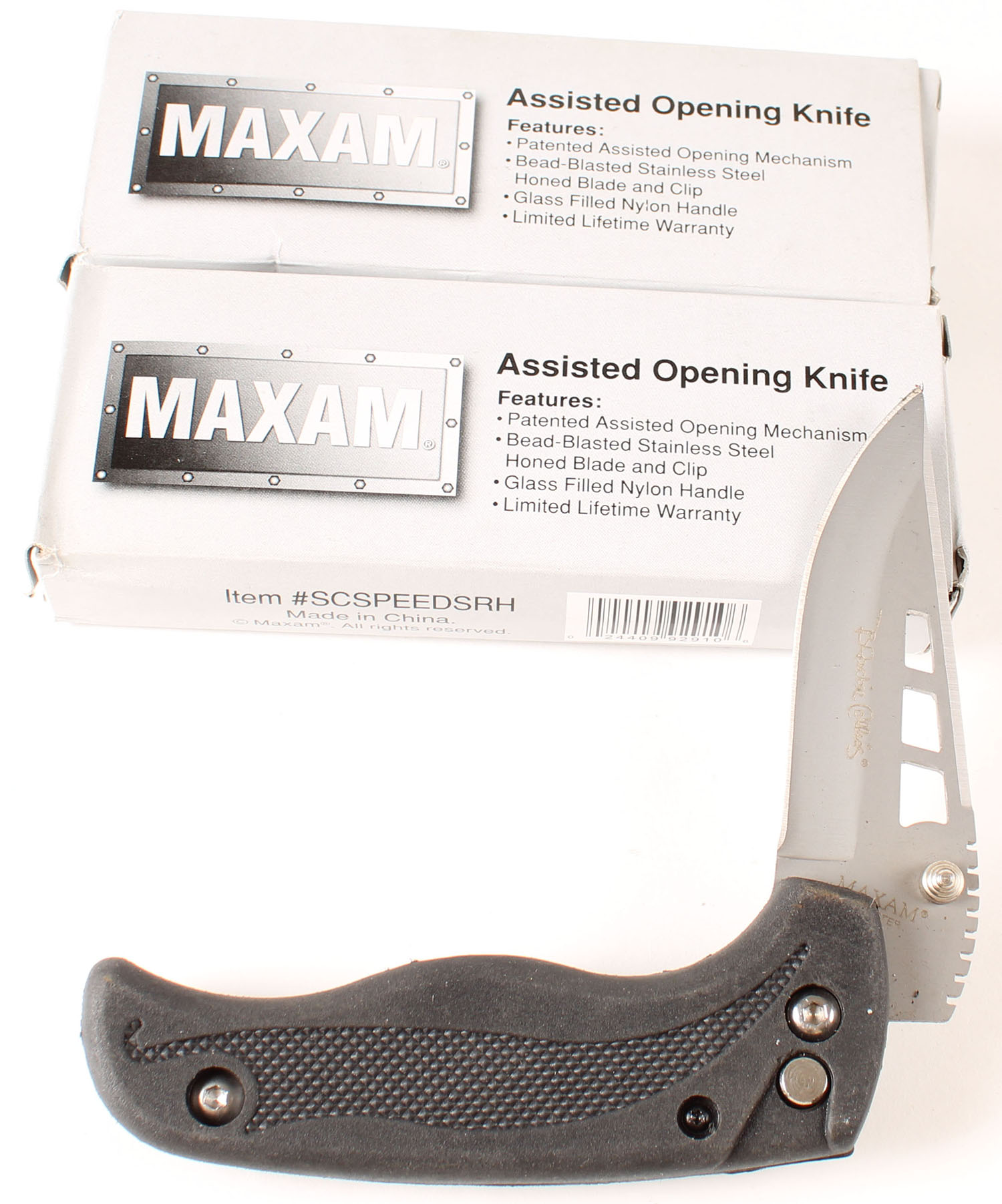 Lot of 2 Maxaam assisted opening knives, in box. Grade: MINT - Value: 10 to 50