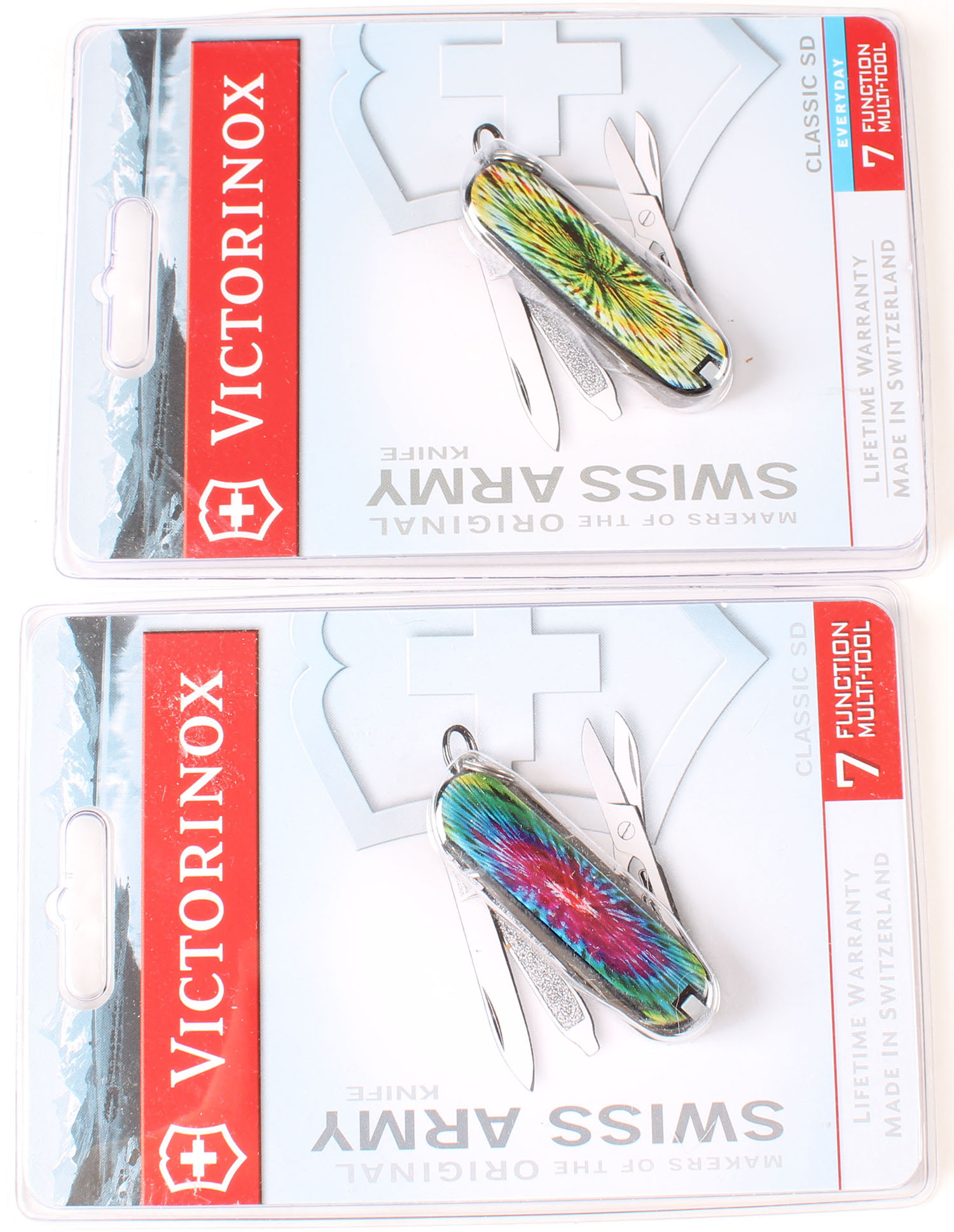 Lot of 2 Victorinox colorful knives, in box. Grade: MINT - Value: 16 to 60
