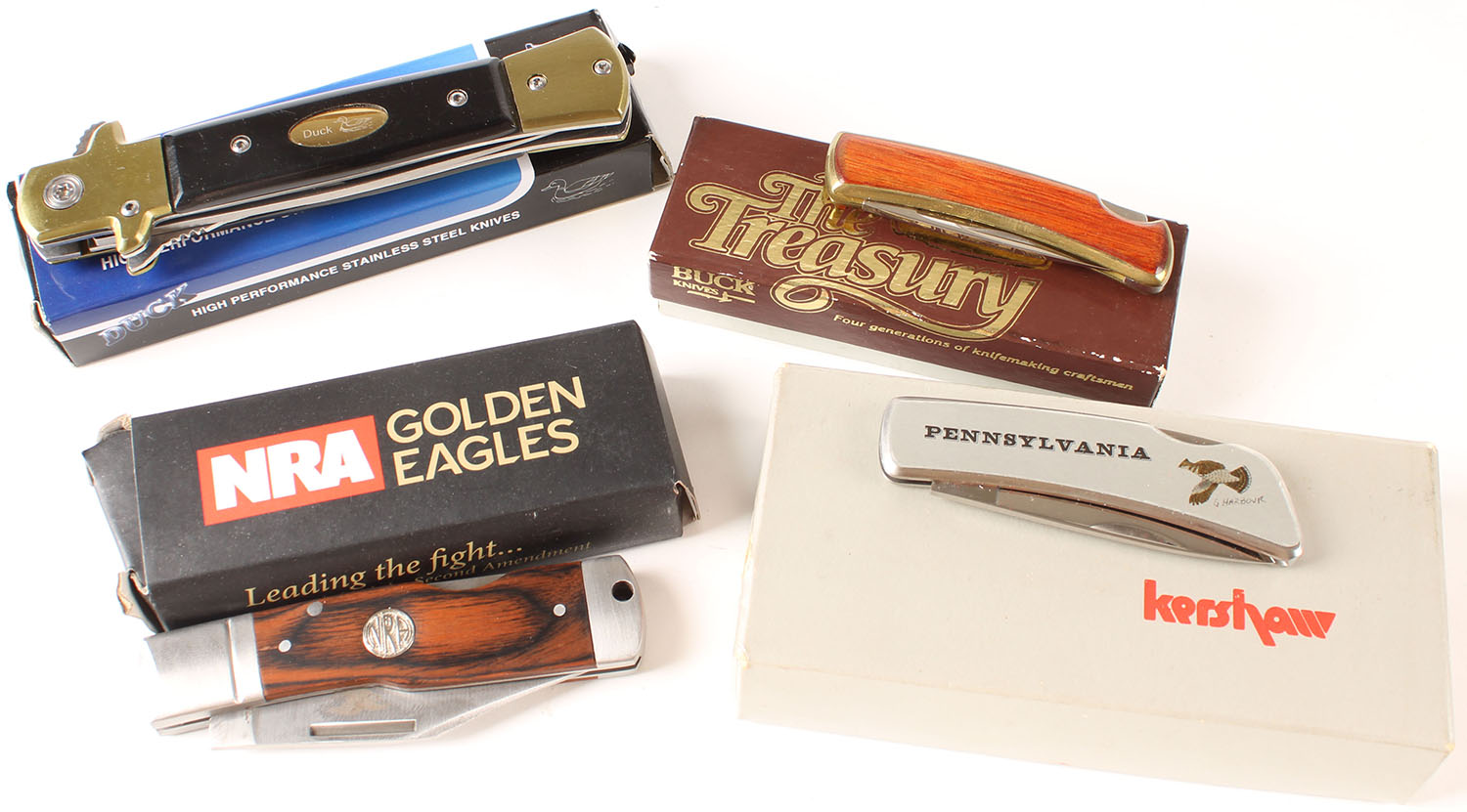 Lot of 4 NRA, Buck, Duck and Kershaw knives, in box. Grade: MINT - Value: 16 to 60