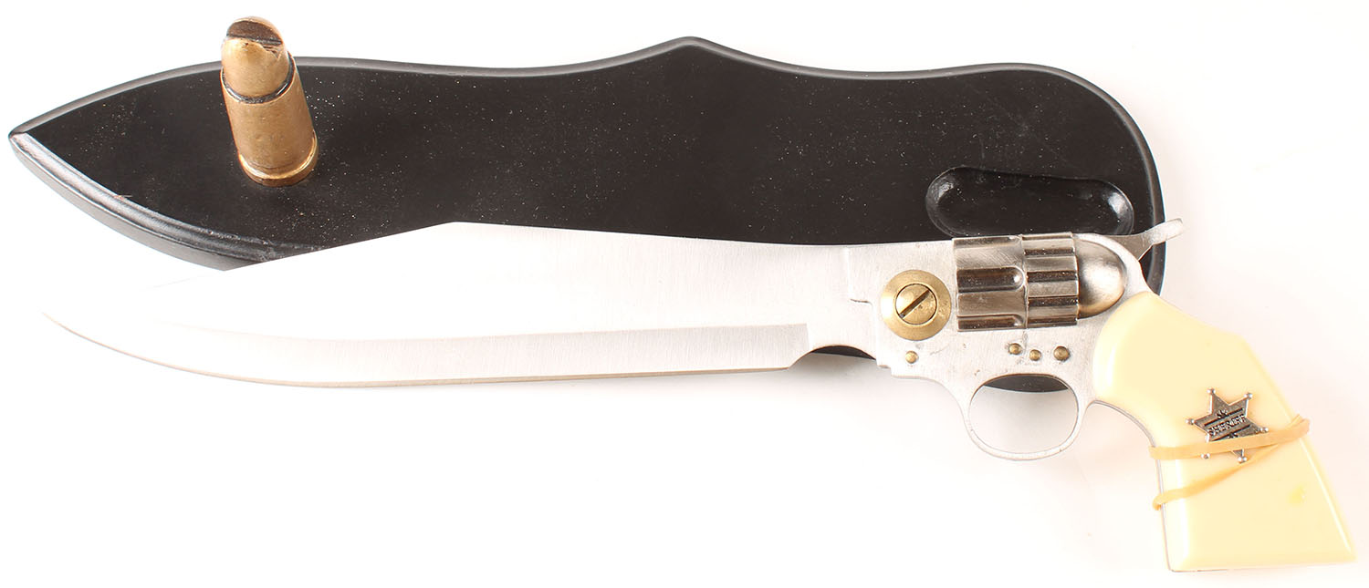 Revolver knife, with display stand, grips need to be glued back on, 7'' blade. Grade: MINT - Value: 20 to 60