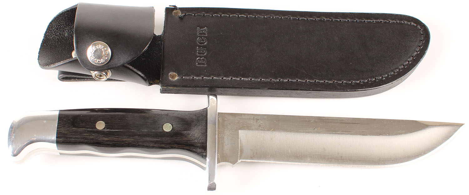 Buck 124+ knife, wood handle, 6 1/2'' blade, has leather sheath. Grade: Excellent ++ - Value: 20 to 80