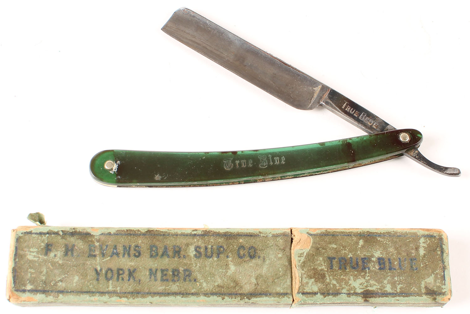 Tru Blue Antique straight razors, some age soiling, both solid. Grade: Very Good - Value: 16 to 50