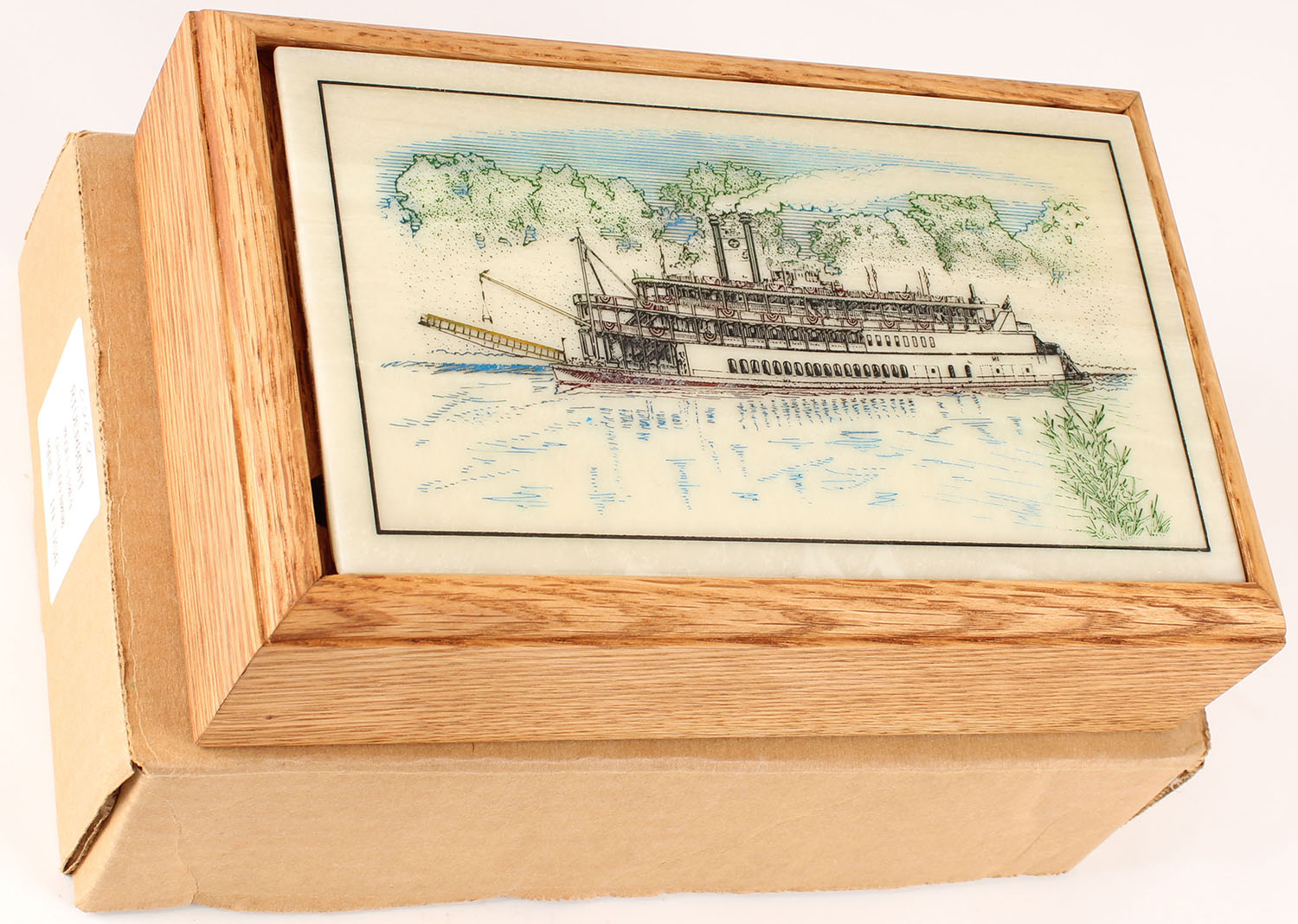 Empty Wood knife display box with intricate design on top of riverboat. Grade: Very Good ++ - Value: 20 to 80