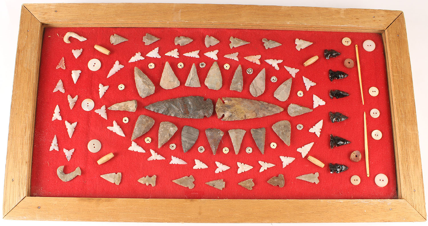 Large lot of large and small arrowheads and spearheads, all solid and clean, under glass and wood display case. Grade: Excellent ++ - Value: 40 to 200