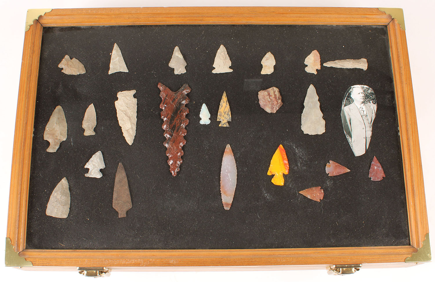 Large lot of large and small arrowheads and spearheads, all solid and clean, under glass and wood display case. Grade: Excellent ++ - Value: 20 to 100