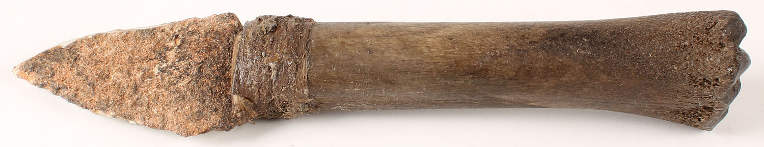 Ancient flint blade knife deer bone handle bison dung and pine pitch glue over sinew 7'' OAL. Grade: Very Good - Value: 50 to 150