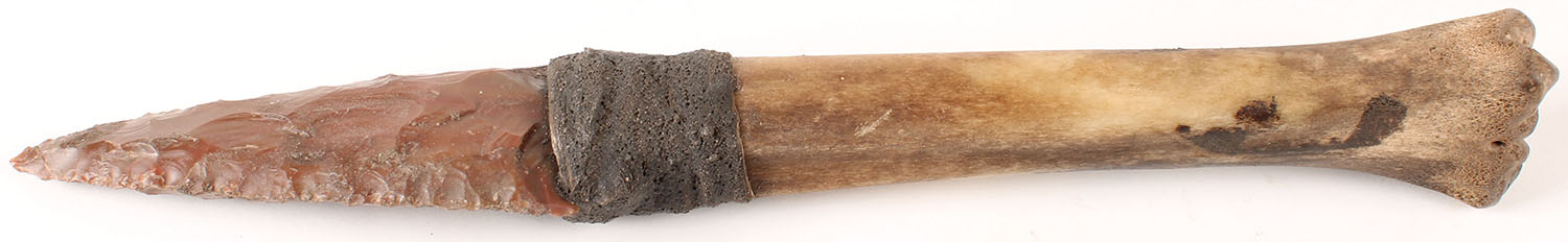 Extremely RARE leg bone handle/flint knife. Sinew wrapped with pine pitch and Buffalo dung glue. The maroonish colored flint blade is beautiful. Ex Edward Emille Dorssom, Ex William Powell estate Leavenworth, Kansas Missouri River rock shelter. Grade: Excellent - Value: 200 to 800