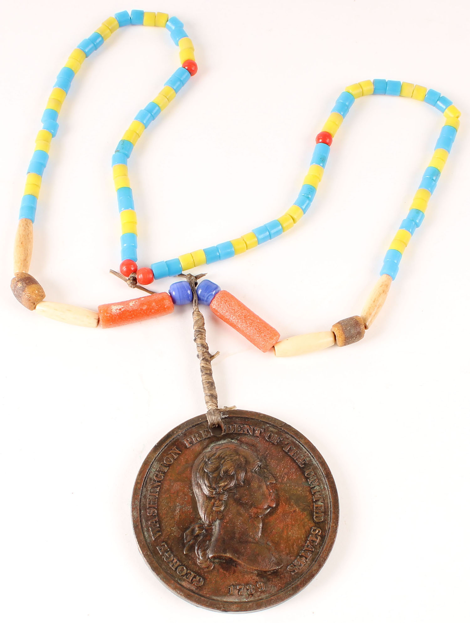 Rare large 1789 George Washington Indian Peace Medal with crossed pipe tomahawk and a hand shake. Strung on sinew with early glass and bone trade beads, Ex Private Museum of Clifford Jenson of Shelly Idaho here is a Great addition to any collection. Grade: Excellent - Value: 100 to 800