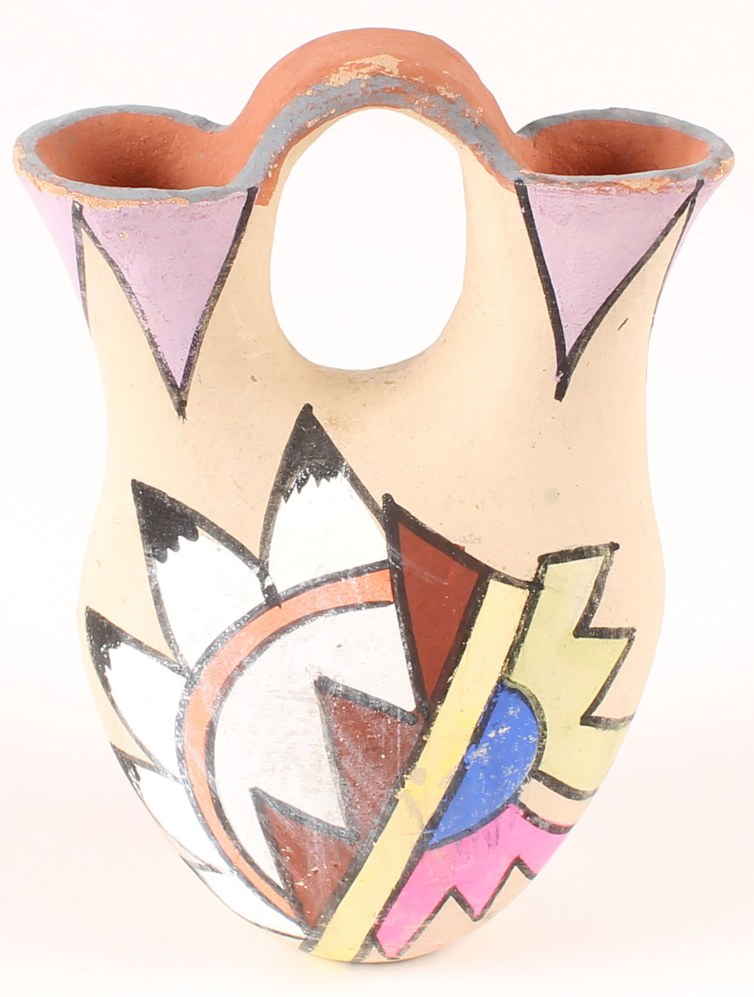 Small Native American pot, has beautiful artwork, 6'' height. Grade: Excellent + - Value: 10 to 100