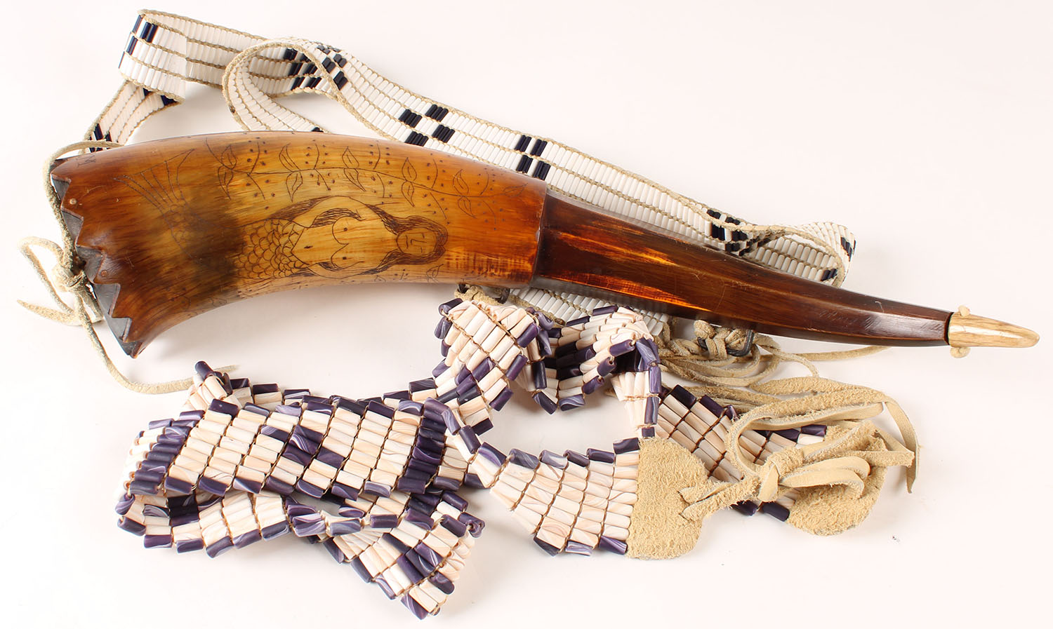 Antique intricately designed powder horn, 14'' OAL, very solid and clean, with beaded sash. Grade: Excellent - Value: 40 to 200