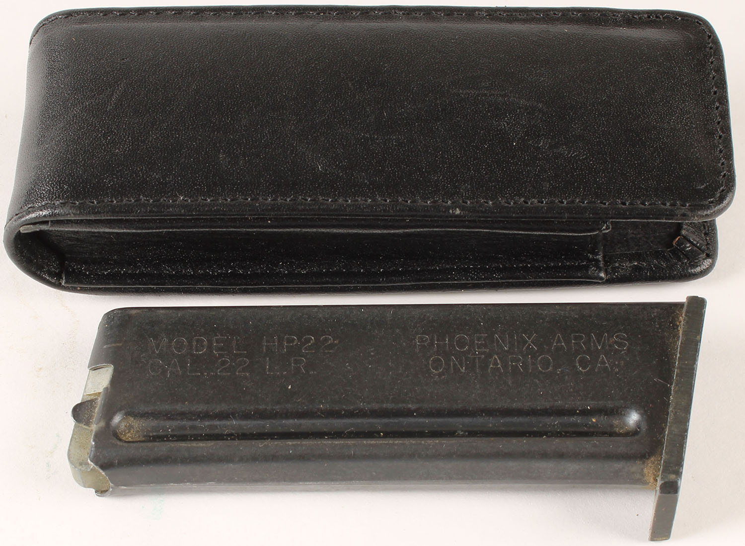 Phoenix Arms .22 LR mag, with leather pouch. Grade: Excellent - Value: 10 to 40