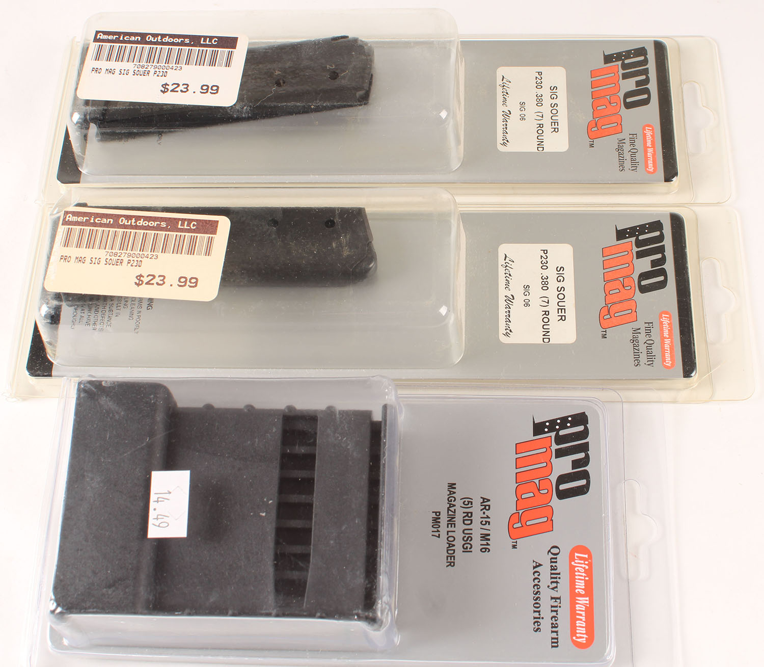 Lot of 3 Pro mag, two Sig sauer P230 .380 7 rd mags and a AR15-M16 5 rd magazine loader. Grade: Excellent - Value: 30 to 90