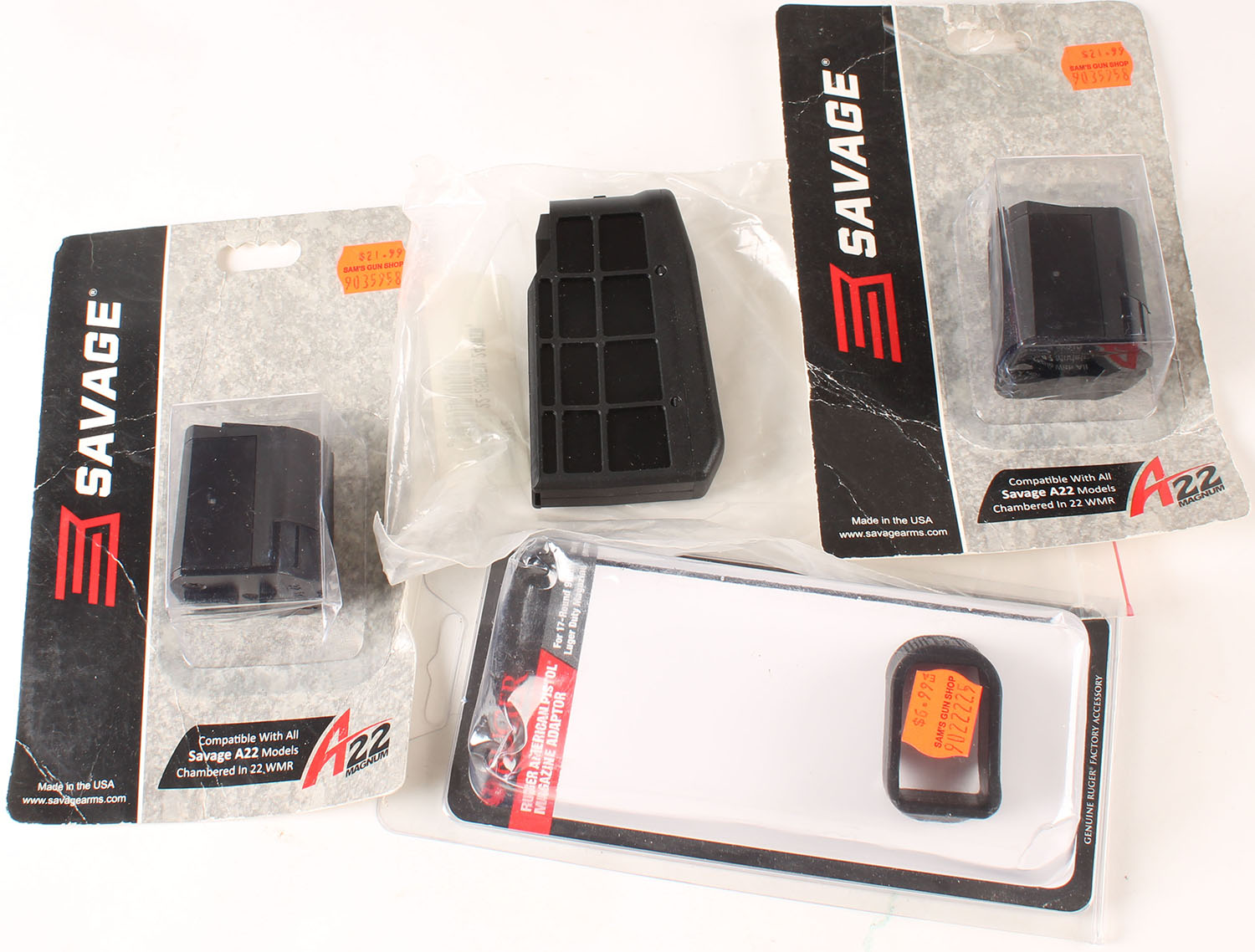 Lot of 4 mags, Ruger, ,ag adapter, 22-250/243 cal and two Savage A22 22 WMR cal mags. Grade: Excellent ++ - Value: 20 to 60