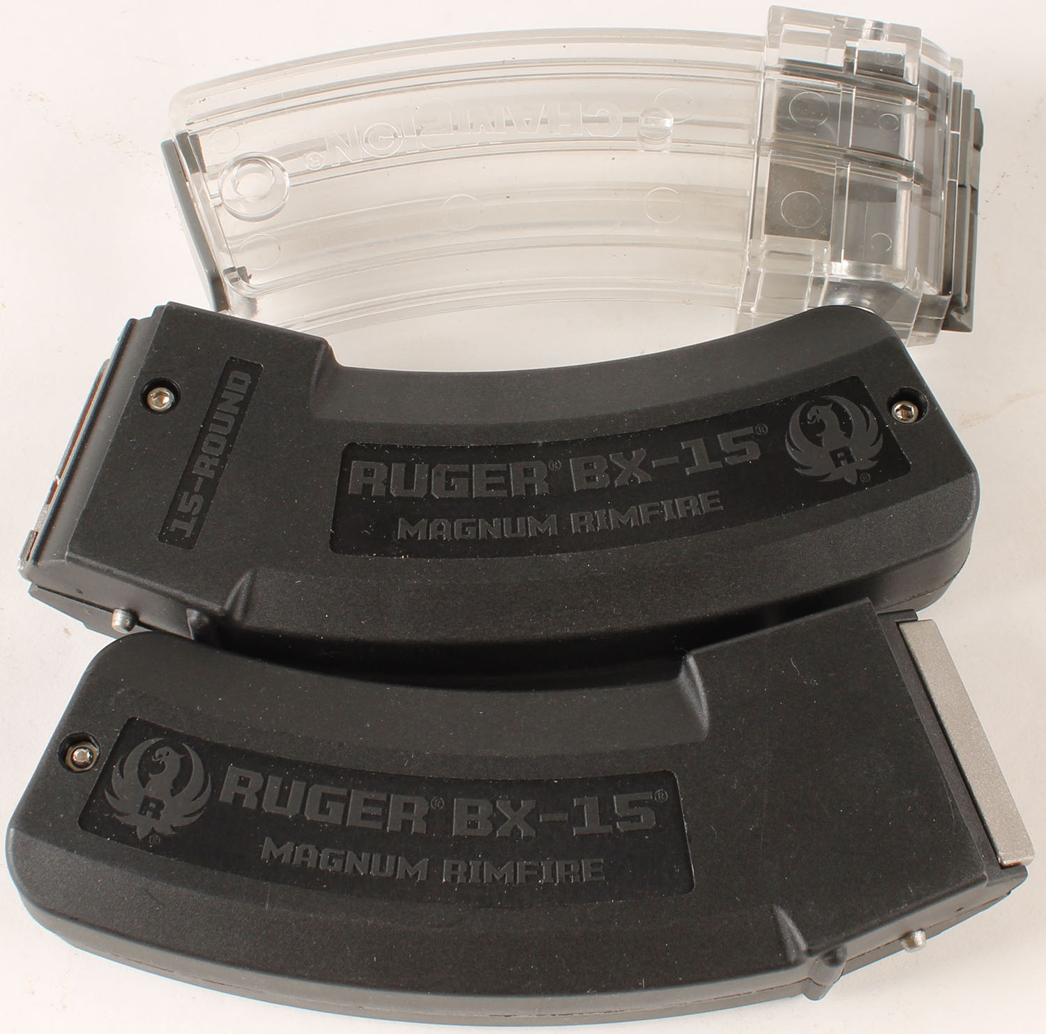 Lot of 3, 2 Ruger Bx-15 .22 LR mags for a 10/22 and 1 Champion .22LR mag for 10/22. Grade: Excellent ++ - Value: 30 to 90