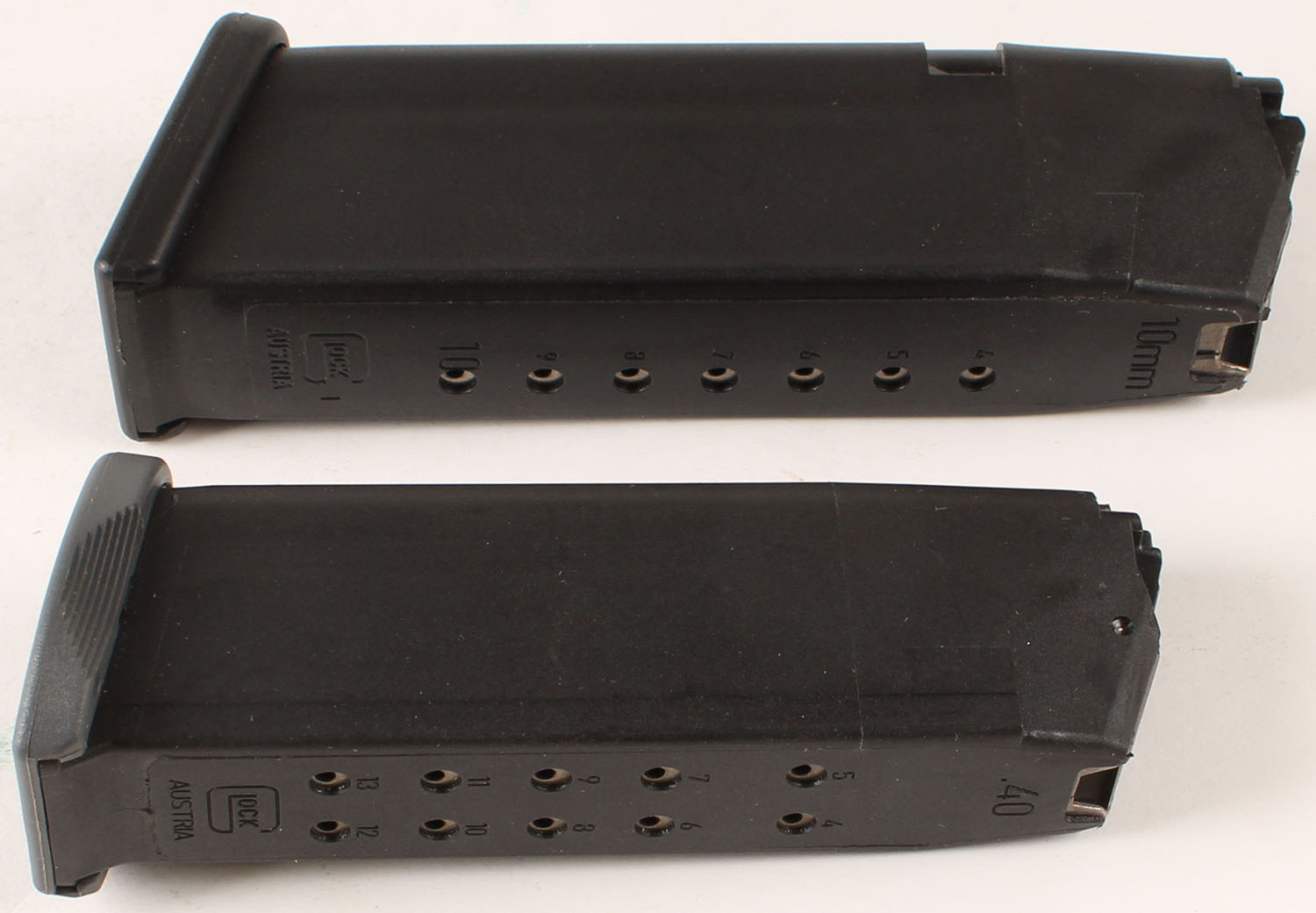 Lot of 2 Glock mags, 40 cal 13 rd and 10 mm 10 rd. Grade: Excellent - Value: 16 to 50