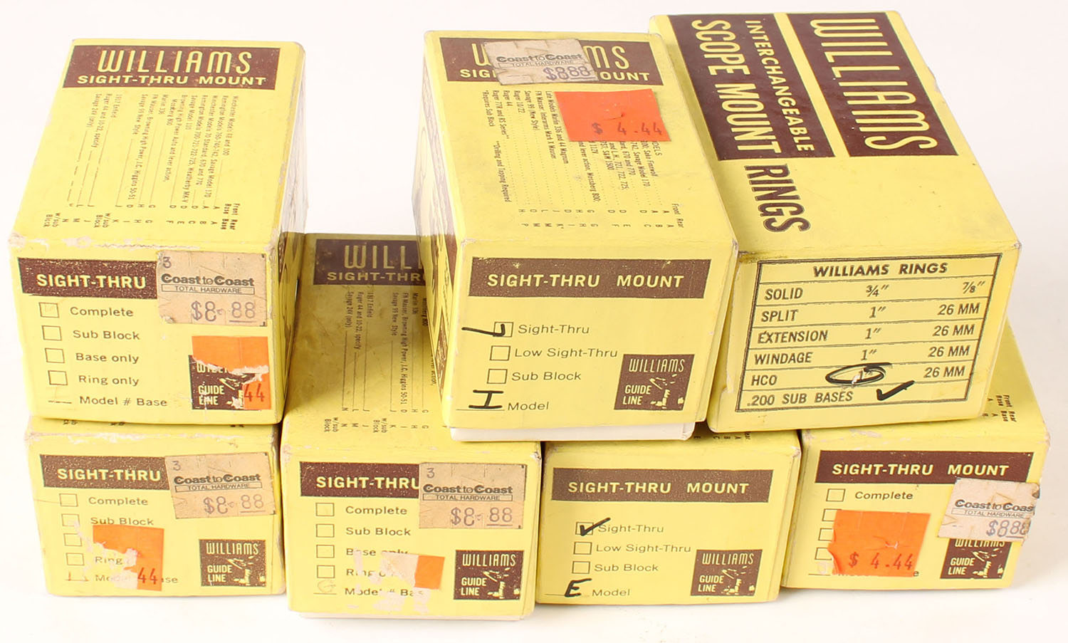 Large lot of Williams scope mount rings, in orignal box. Grade: Excellent - Value: 10 to 50