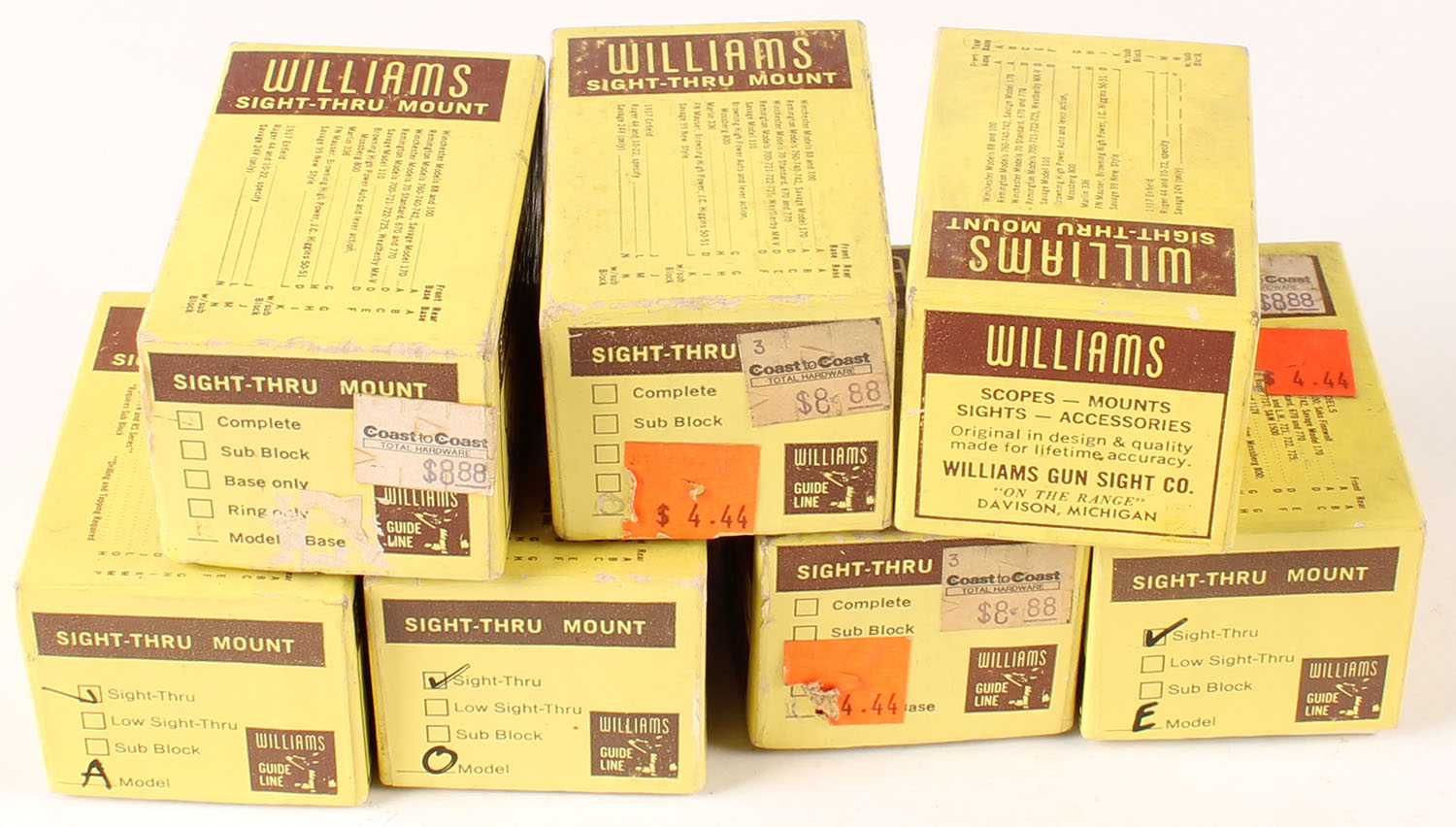 Large lot of Williams scope mount rings, in orignal box. Grade: Excellent - Value: 10 to 50