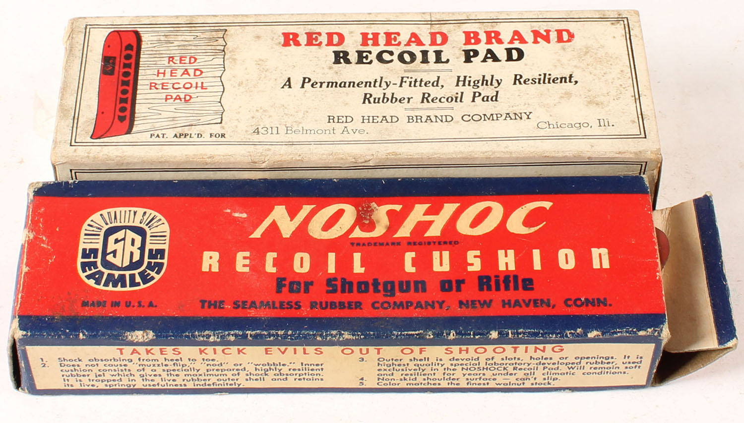 Lot of 2, antique NosHoc Recoil pad with original box, antique Red Head Brand box with a checkered blued metal buttplate, appears to be from a Winchester shotgun, Grade: Very Good ++ - Value: 10 to 50